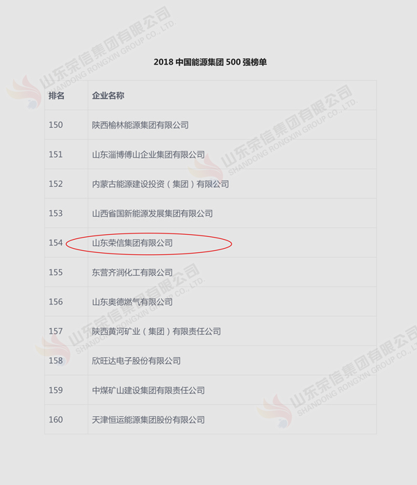 近日,“2018中國能源集團(tuán)500強(qiáng)”榜單發(fā)布,山東榮信集團(tuán)有限公司榜上有名,位列第154名,比去年上升14位。