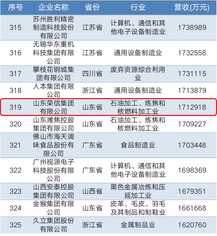 8月22日,全國工商聯(lián)在青海發(fā)布了“2019中國民營企業(yè)500強”系列榜單,山東榮信集團以1712918萬元的營業(yè)收入位列中國民企制造業(yè)第319位,這是集團第四次榮列中國民企制造業(yè)500強榜單。