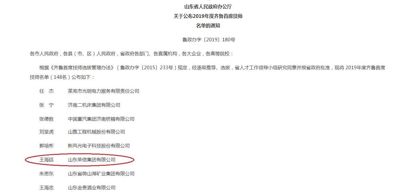 日前,山東省政府辦公廳發(fā)布《關(guān)于公布2019年度齊魯首席技師名單的通知》,共選出148名2019年度齊魯首席技師。集團(tuán)選拔推薦的動(dòng)力分廠廠長(zhǎng)王海廷成功入選。