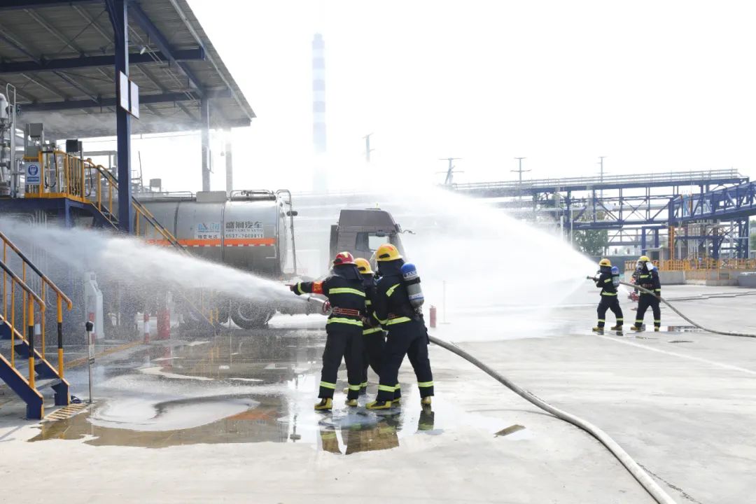 此次演練模擬情景設(shè)置為危險(xiǎn)化學(xué)品酚油裝車泄漏著火。隨著總指揮一聲令下,公司立即啟動(dòng)危險(xiǎn)化學(xué)品泄漏應(yīng)急救援預(yù)案,救援工作環(huán)環(huán)相扣,分工明確,有序開展。應(yīng)急處置組首先對(duì)裝車閥前管道泄漏的酚油進(jìn)行圍堵,動(dòng)用現(xiàn)場(chǎng)資源及相關(guān)救援設(shè)備,開展現(xiàn)場(chǎng)救援工作;后勤保障組負(fù)責(zé)疏散其他無(wú)關(guān)人員,第一時(shí)間清點(diǎn)人數(shù);滅火戰(zhàn)斗組及時(shí)撲滅初期火災(zāi),向現(xiàn)場(chǎng)指揮報(bào)告情況;搶險(xiǎn)搶修組攜帶防爆工具和堵漏卡具對(duì)酚油泄漏點(diǎn)進(jìn)行現(xiàn)場(chǎng)搶修。在各應(yīng)急小組的密切配合下,危險(xiǎn)化學(xué)品酚油裝車泄漏著火事故被成功處置,險(xiǎn)情解除。